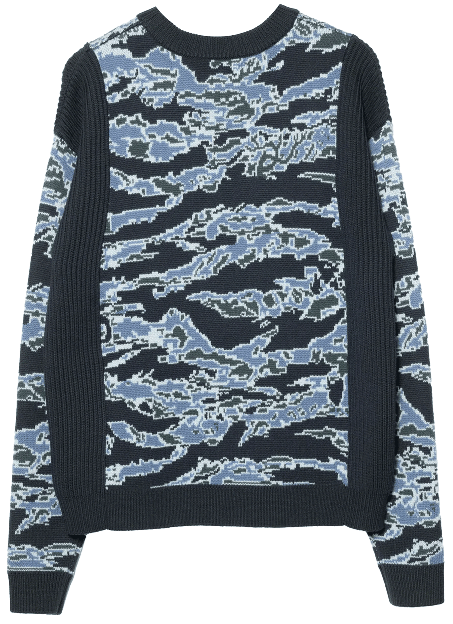 A camouflage-knit crew sweat in a seasonal Arctic colorway, crafted from 100% Merino wool for superior softness, warmth, and breathability. This piece features an all-over DPM: Bonsai Tigerstripe pattern, with ribbed finishes at the neck, cuffs, and hem, and underarm ventilation for enhanced comfort.