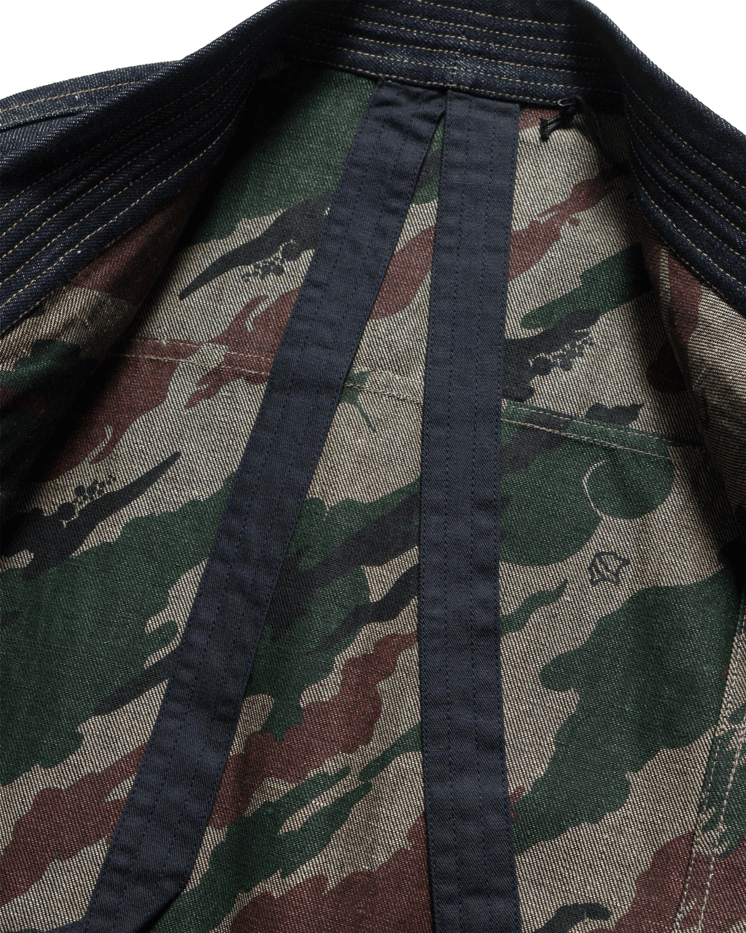 Kimono jacket crafted from Japanese 13oz hemp-cotton denim, cut to a relaxed fit. Featuring patch pockets, a centre front tie closure, and internal carry straps for hands-free transport when not worn—fusing traditional silhouettes with modern utility.