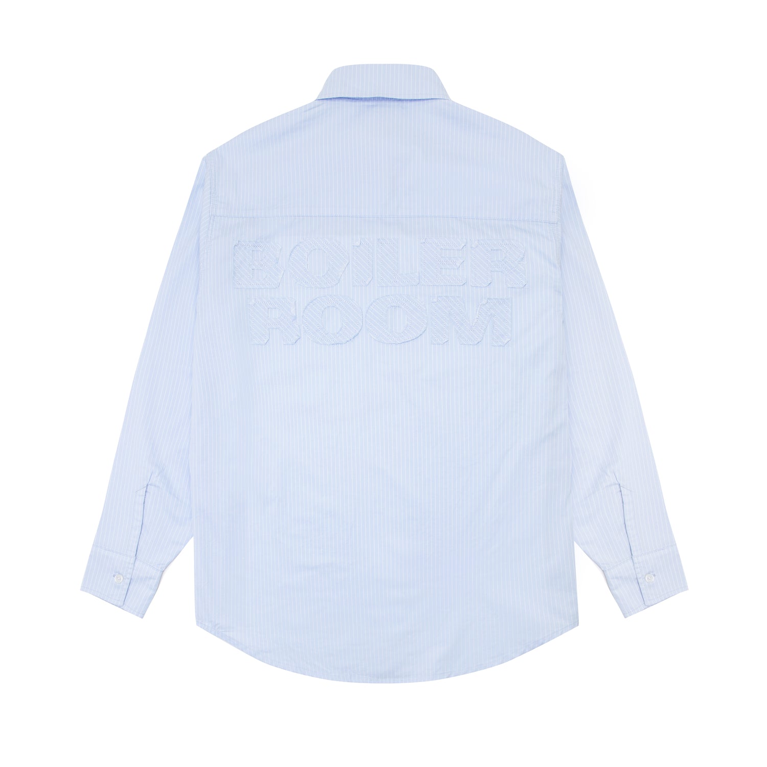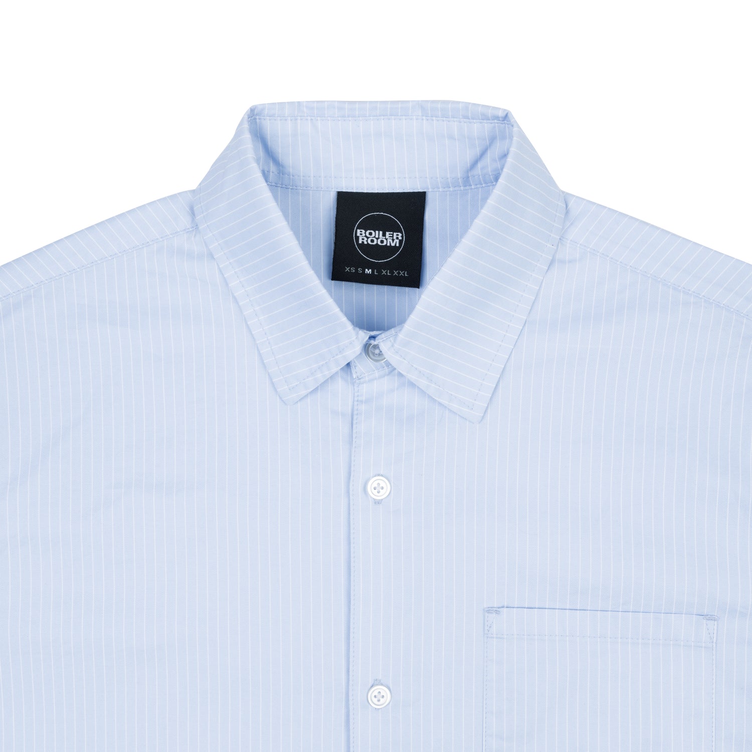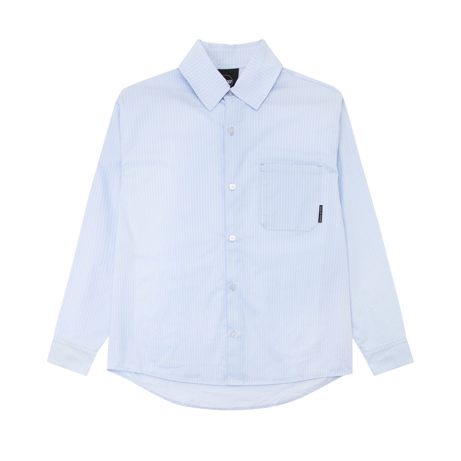 - Long sleeved collared poplin shirt in subtle blue/white pinstripe.