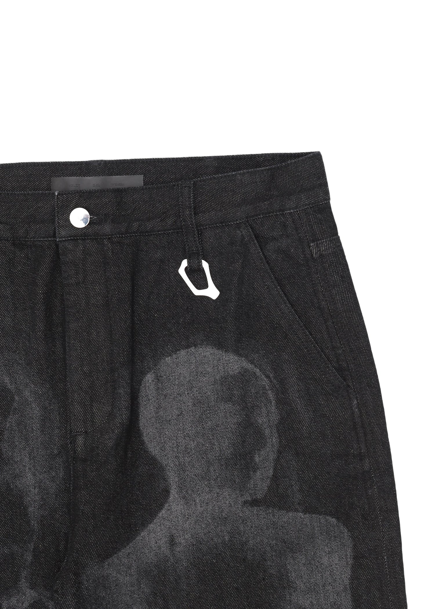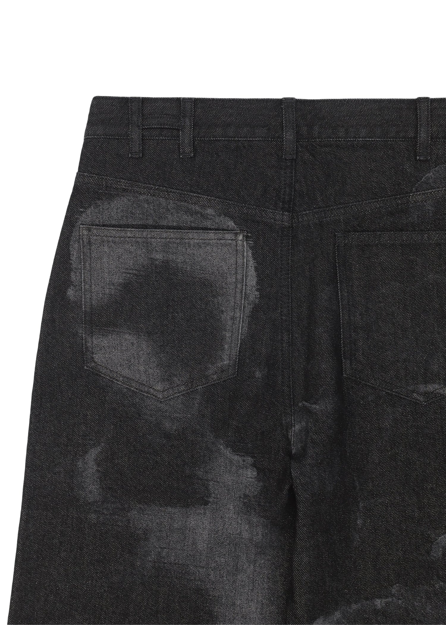 Black Wide-Leg Denim Trousers crafted in 100% cotton and treated with an oil-wash process for a distinctive, washed-out appearance. This cold-dye technique is applied to the finished garment at room temperature, avoiding heat and preserving fabric integrity. The design features a classic back yoke, slant front pockets, patch back pockets, and a functional carabiner attached to the right front belt loop. Finished with a laser-engraved pattern for subtle detailing.