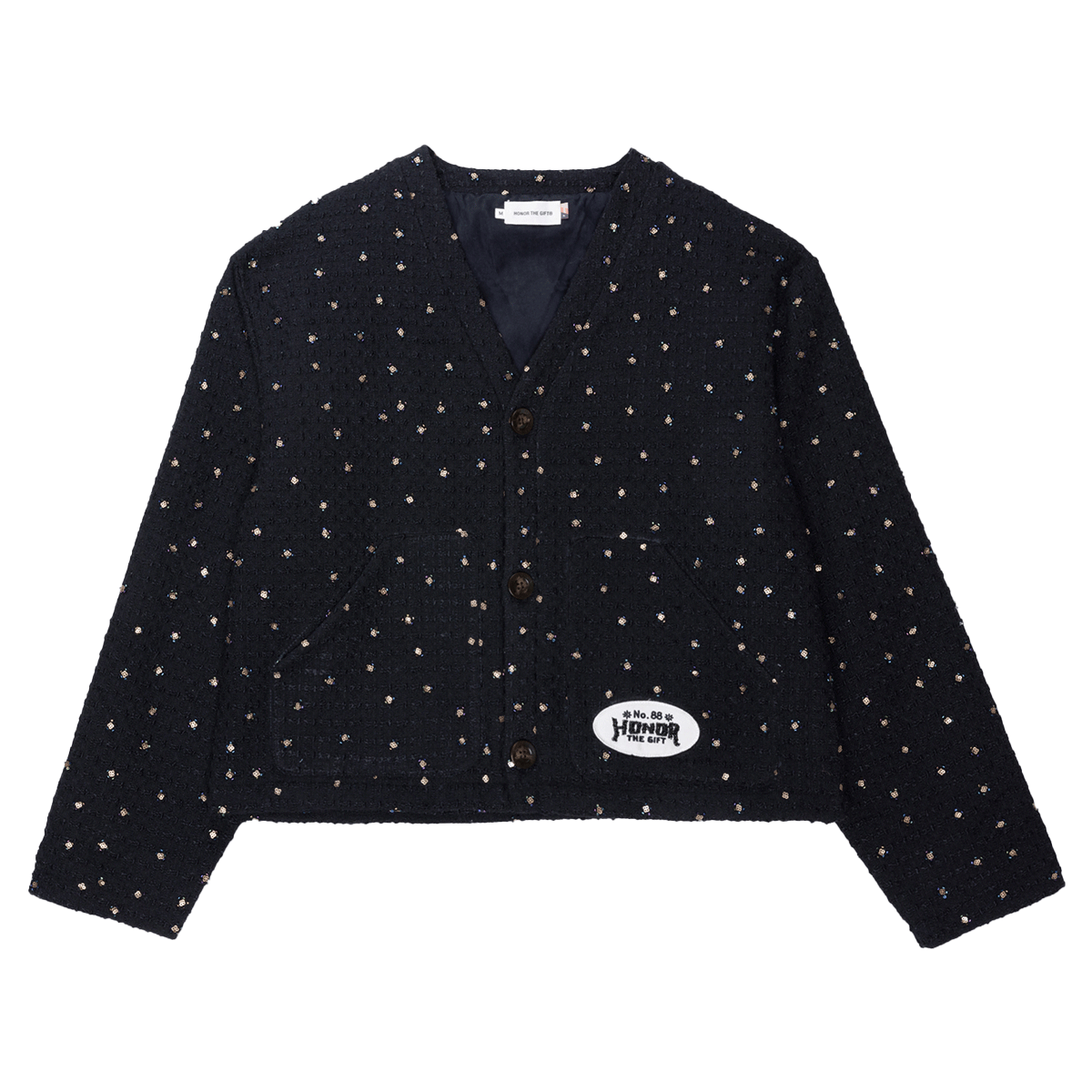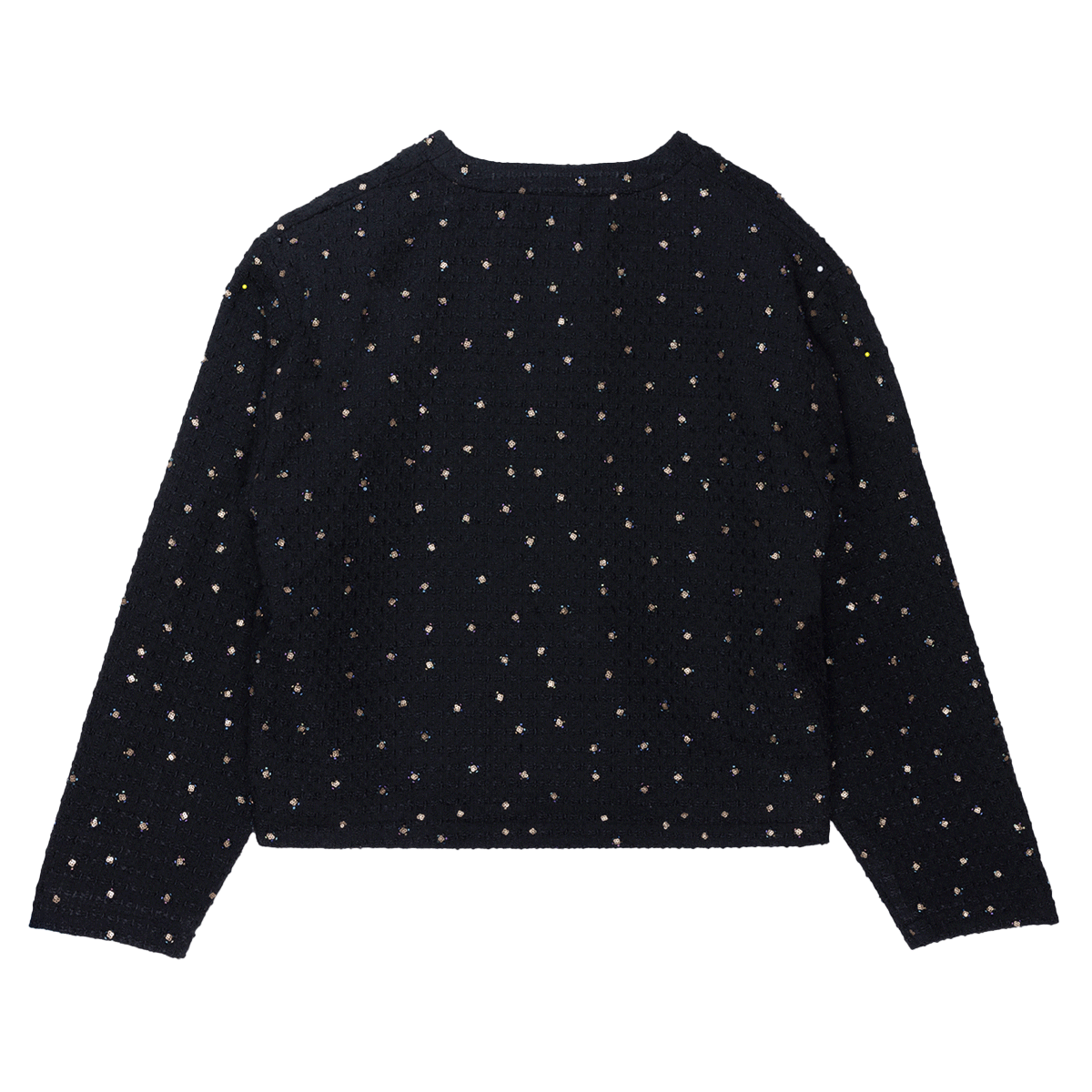 A modern twist on a classic layer, this cropped cardigan features a button-front closure and is crafted from a novelty beaded arts fabric that adds unique texture and visual interest. Designed to fit true to size.