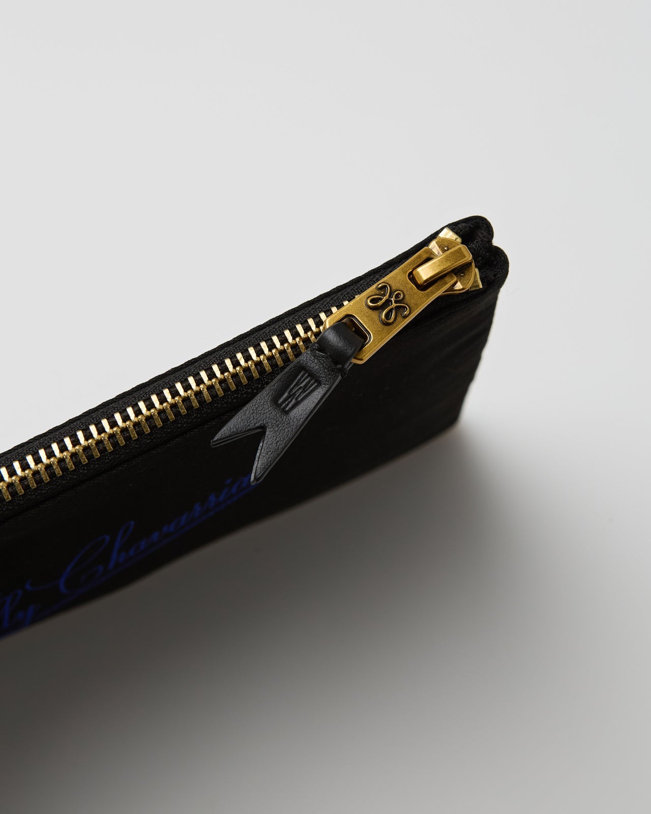 The Casa de Chavarria Pouch showcases refined minimalism with bold graphic accents. It features the signature “Tailoring” woven label alongside a thread-embroidered Casa de Chavarria motif, complete with “La Casa de Chavarria” and address details. A calf leather zipper pull adds a premium finish, while the unlined, pocket-free interior keeps the design clean and versatile.