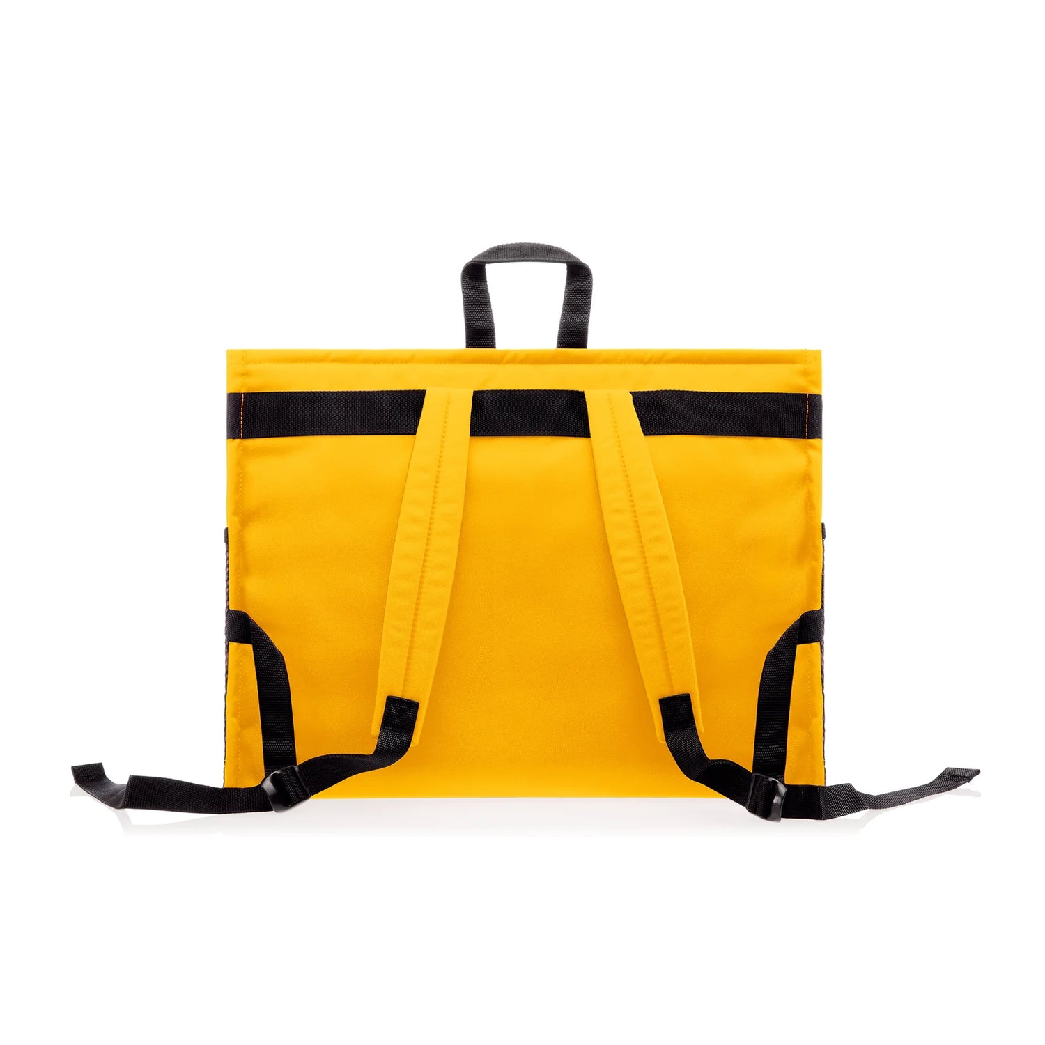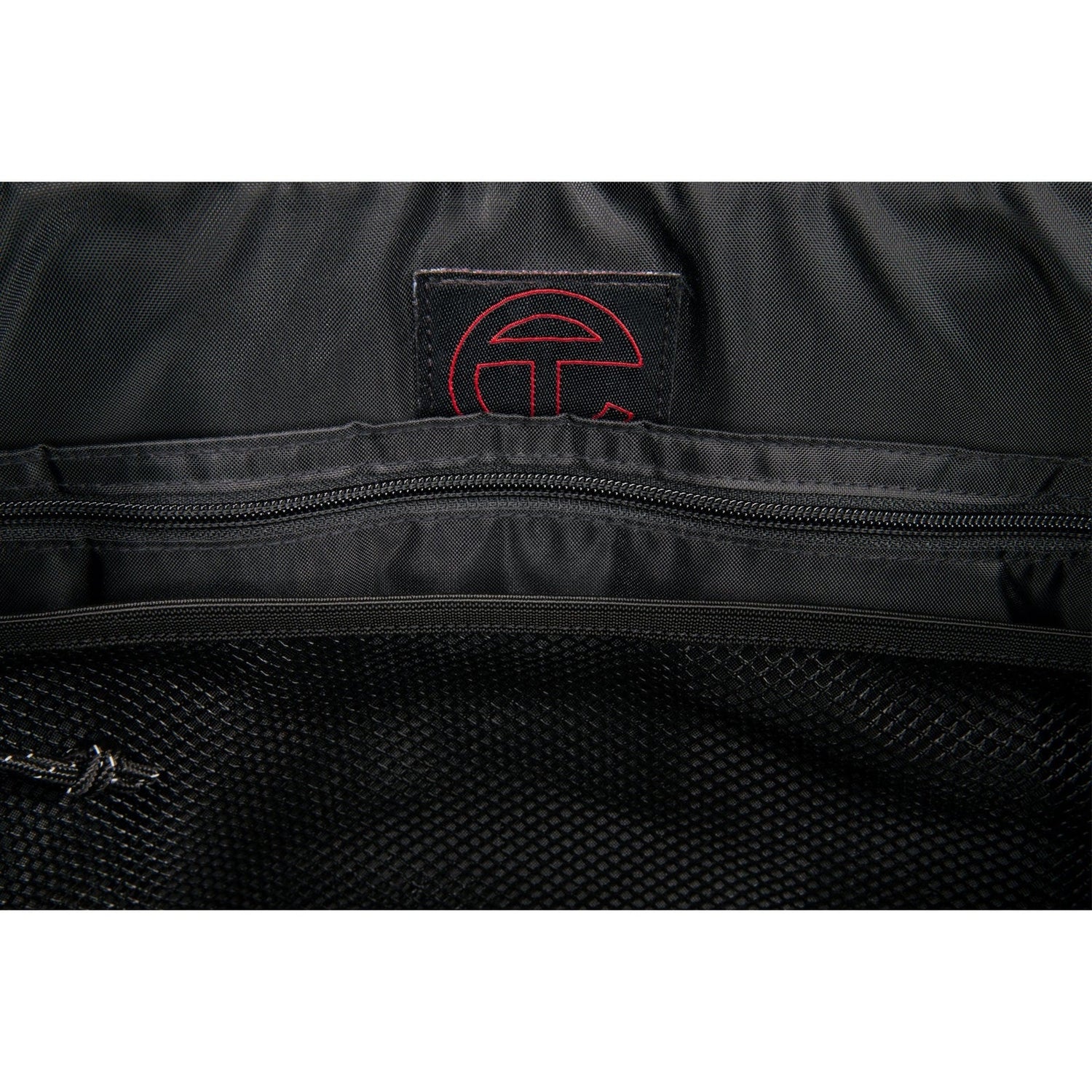 Designed for maximum versatility with woven hand straps, a removable and adjustable padded shoulder strap, and hidden backpack straps on the reverse for hands-free options. The exterior includes an embossed TELFAR logo, top zipper closure, and side mesh pockets. Inside, it features a zip pocket and a padded laptop compartment for organized carry.