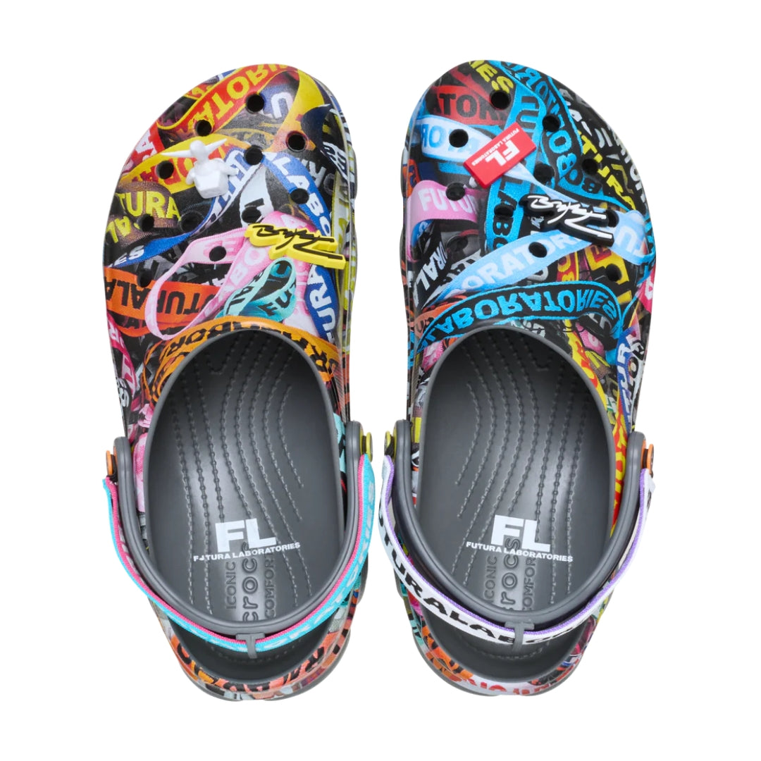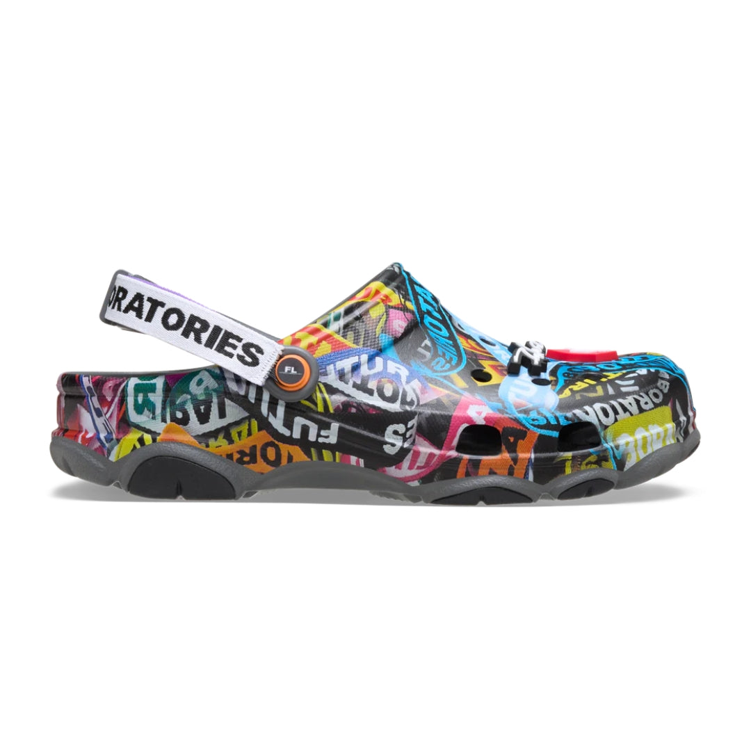 Futura Laboratories brings its classic FLanyard to the All-Terrain Clog, covering the upper in a colorful print of tangled lanyards. The clog is topped with 4 exclusive Jibbitz™ charms including Futura’s notable signature. Two mismatched woven FLanyards, one pink and one blue, cover the ankle straps with the FL logo on the outside of each rivet. This rugged silhouette has lug outsoles for increased traction and adjustable straps for a perfect fit.