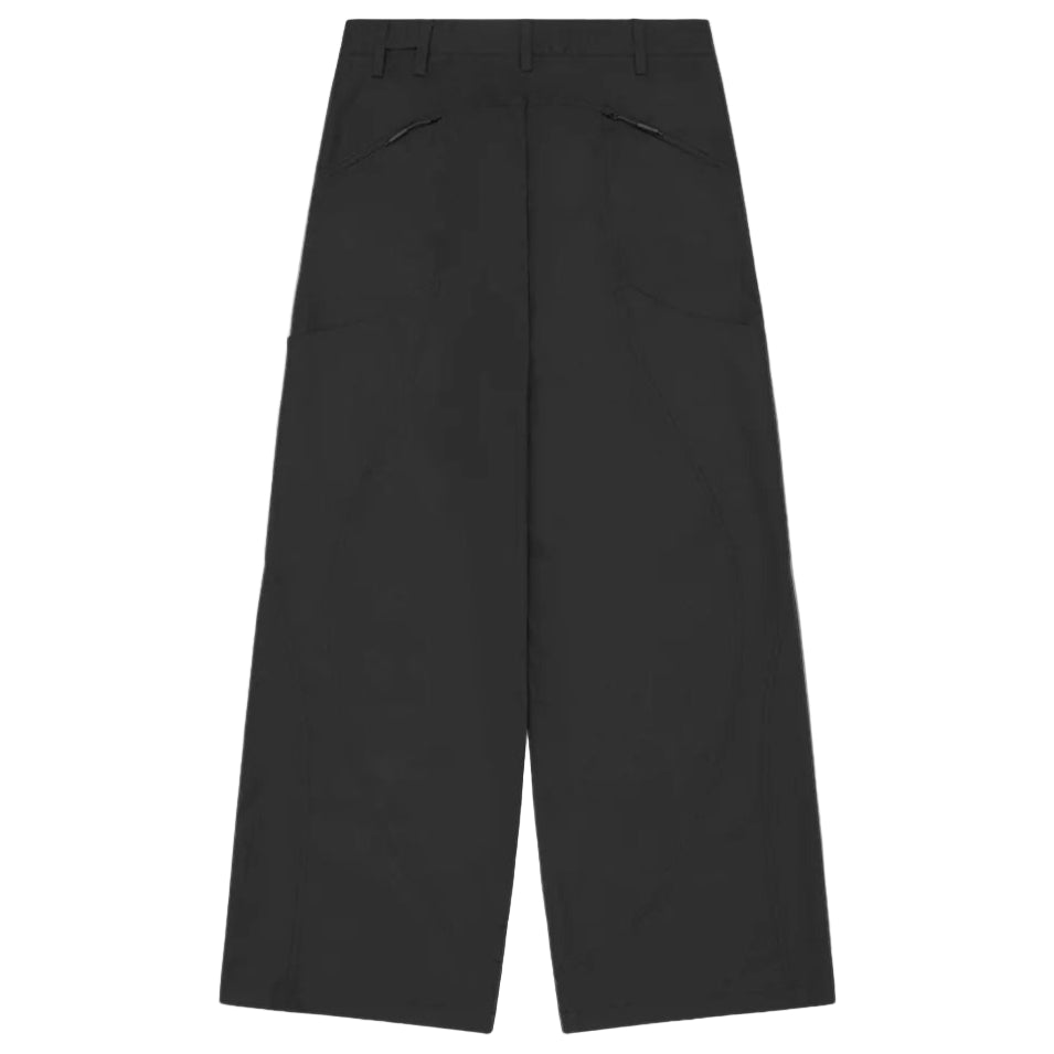 Straight Fit Trousers in black, crafted from a plain basket weave fabric that offers subtle texture and structure. Designed with a clean silhouette, the trousers feature slant front pockets, zippered back pockets, and a metallic press-button and zipper closure for a functional finish.