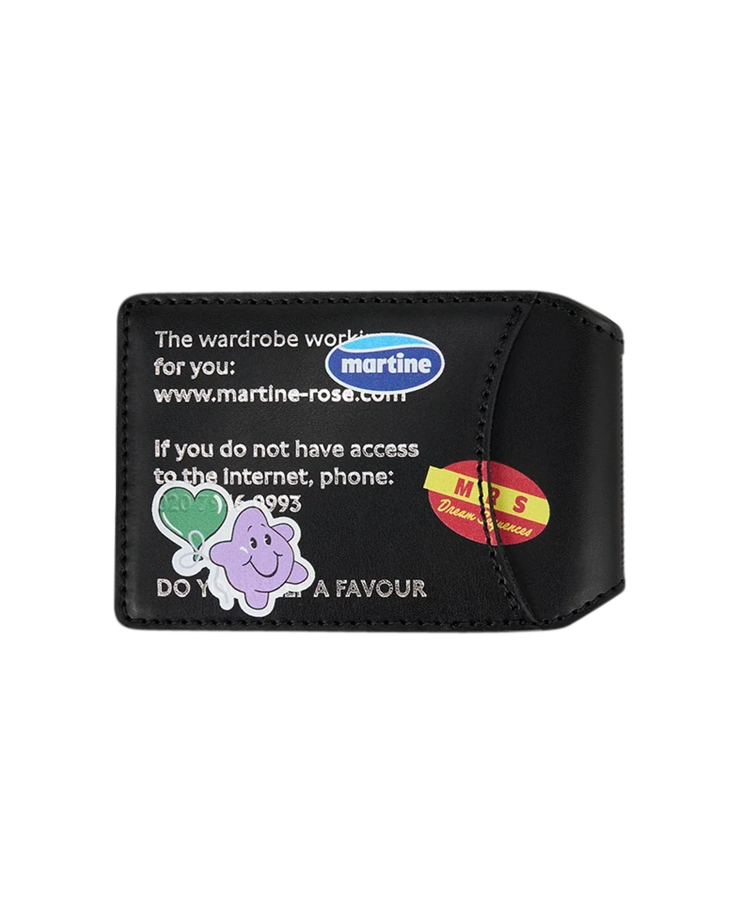 SOFT LEATHER CARD WALLET WITH PRINTED SILVER MARTINE ROSE BRANDING AND SEASONAL STICKER GRAPHICS. FEATURING FOUR INNER CARD SLOTS AND A POCKET AT THE BACK TO STASH THE CASH. DO YOURSELF A FAVOUR.