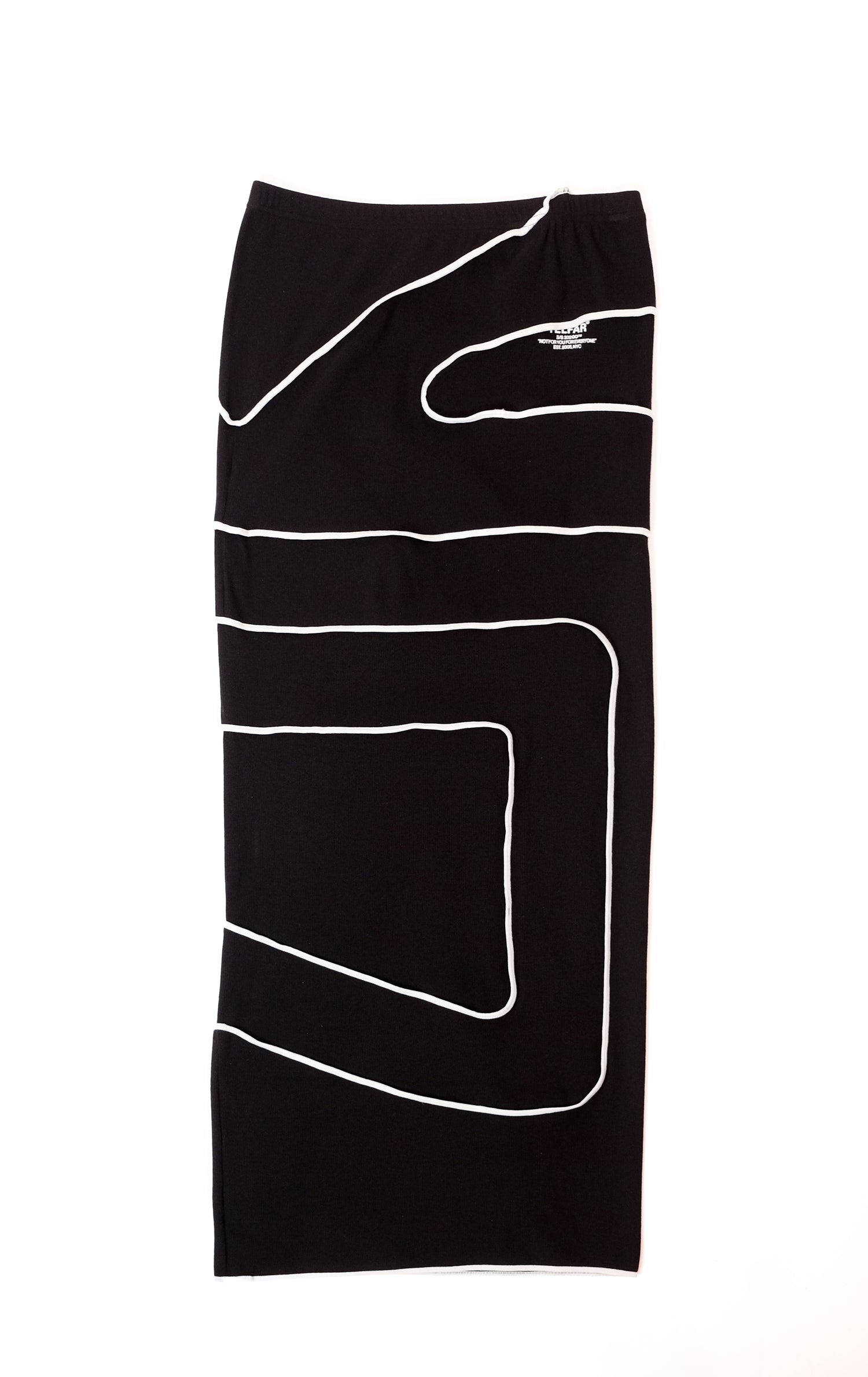 The Pieced Rib Maxi Skirt features a mid-rise waist and A-line silhouette, crafted from a signature cotton-blend knit. Designed with exposed, elevated seams that layer to form a contrasting logo detail.