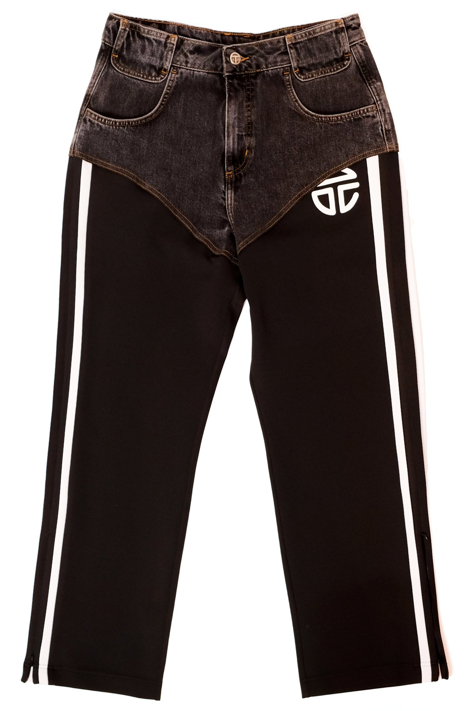 Designed with tailored denim cut-out blocks and custom hardware, it features deep slit pockets at the front and back. From mid-thigh down, it transforms into the classic track pant with sculptural stripes along the side panels and zipper closures for added edge.