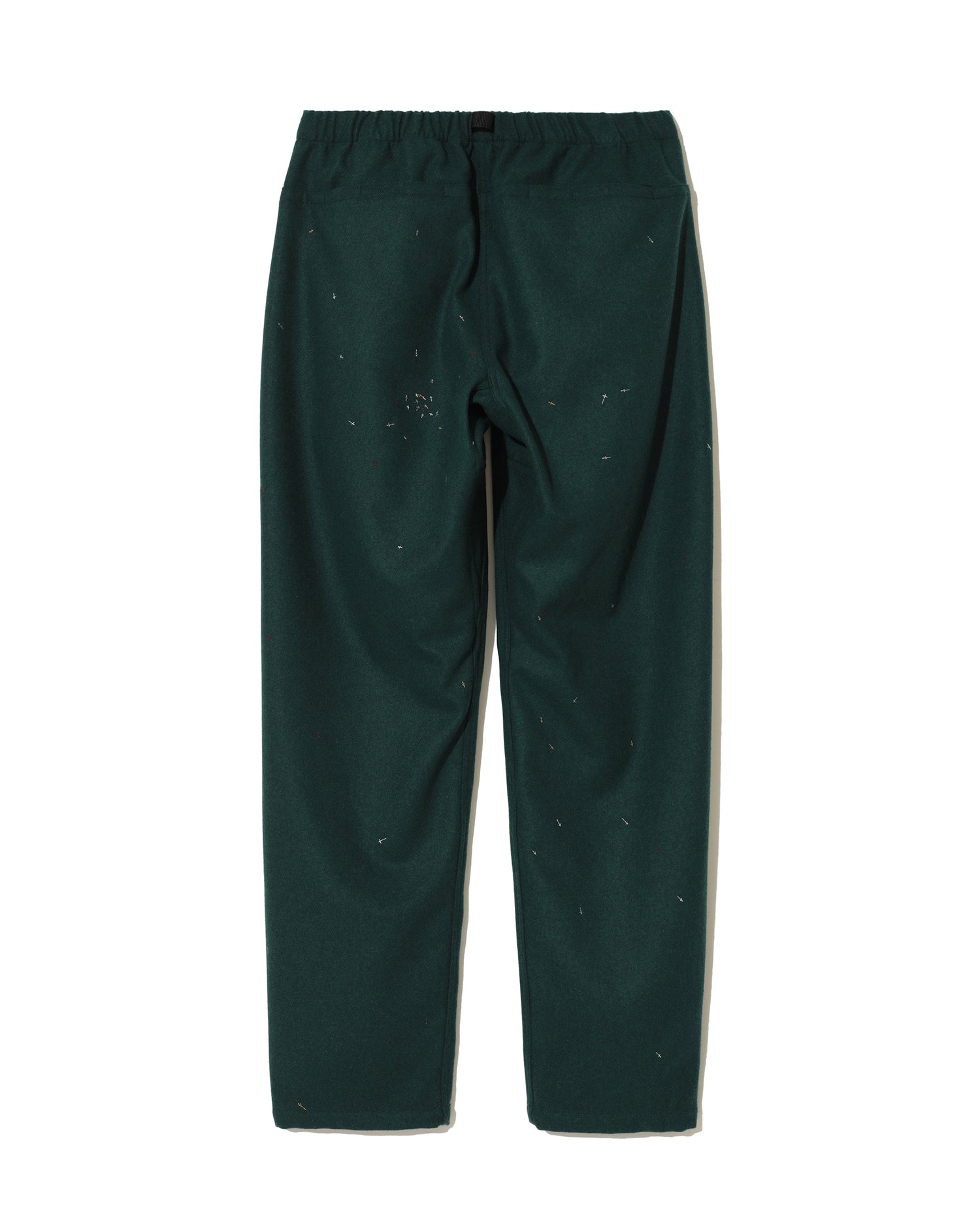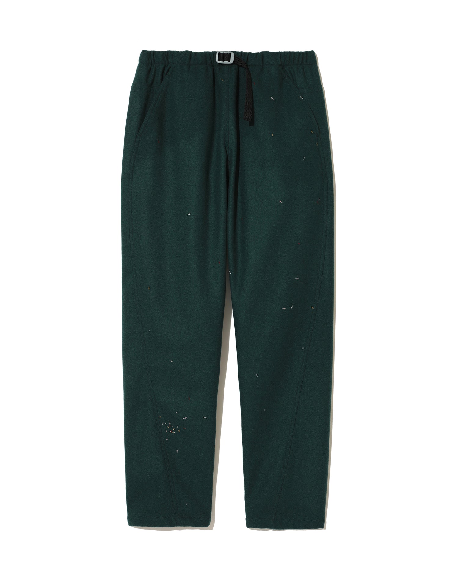 Wool blend trouser featuring canvas draw belt, subtle embroidery, and curved seams.